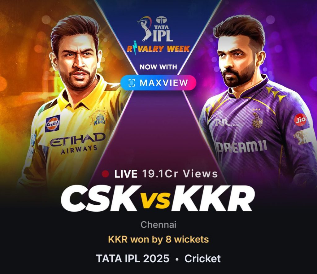 आज, 11 अप्रैल 2025 को चेन्नई के एम. ए. चिदंबरम स्टेडियम (चेपॉक) में खेले गए IPL 2025 के 25वें मैच में ( CSK VS KKR ) चेन्नई सुपर किंग्स (CSK) ने कोलकाता नाइट राइडर्स (KKR) के खिलाफ बल्लेबाज़ी करते हुए 103 रन बनाए।